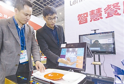 餐饮博览会上,参展商在为观众介绍可人脸识别结算的智慧餐台。成加贝 摄/东方IC
