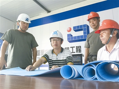 新疆塔建集团副总经理莫云波(左二)在施工现场查看图纸