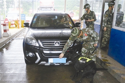 边防官兵正在对出入边境的车辆进行检查。