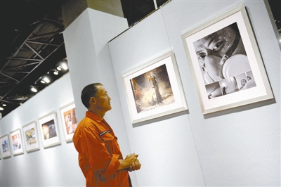 6月28日,中铁四局一名工人在观看“农民工·我的兄弟姐妹”摄影展西安站展览。