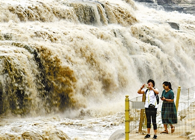 7月2日,游客在山西吉县黄河壶口瀑布游览拍照。