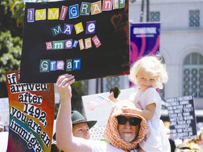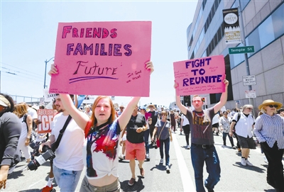 当日,洛杉矶市上万民众聚集在洛杉矶市政厅前,抗议特朗普政府导致“骨肉分离”的移民政策。