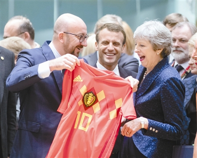 6月28日,在比利时布鲁塞尔举行的欧盟峰会上,比利时首相查尔斯·米歇尔(左)送给英国首相特雷莎·梅(右)一件比利时足球队衣。
