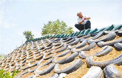 工人在椅子山综合治理区内检查喷灌装置(7月1日摄)。河北唐山滦县榛子镇椅子山采石场历史上因数十年的无序开采,造成了大范围的石灰岩白茬断面,被群众称为“白茬山”。2015年以来,河北省国土部门与当地镇政府合作,对椅子山废弃采石场开展了矿山地质环境恢复和综合治理工程,让昔日满目疮痍的矿坑荒山重焕生机。 新华社记者 牟宇 摄