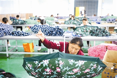 7月4日,西乡县高土坝社区的女工在社区内的雨具厂内加工雨伞。