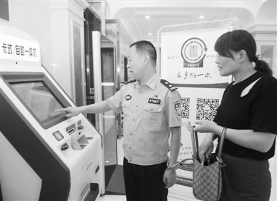 7月3日,在浙江省青田县公安局出入境办证中心,工作人员协助市民在签注自助一体机上办理港澳签注。该一体机可将办理签注的时间从7个工作日缩短到3分钟。