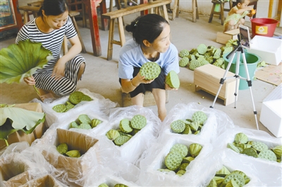 7月4日,江西省遂川县枚江镇高升村村民刘红兰在家里网上直播销售当地特产莲蓬等农产品。