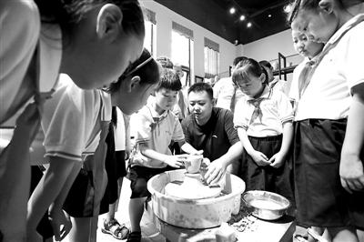 7月9日,在河北省内丘县邢瓷文化体验馆,小学生体验邢白瓷制作工艺。