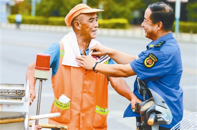 7月7日,文安县城管局工作人员为环卫工人发放毛巾。