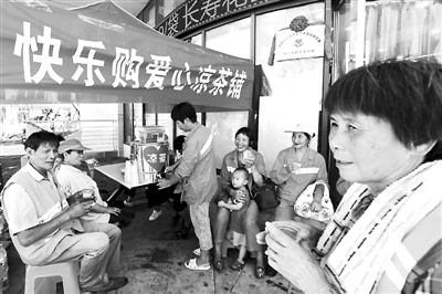 7月10日,浙江舟山市定海区金塘镇的环卫工在“爱心凉茶铺”喝茶休息。当天,由金塘个协和大东方超市共同组设的“爱心凉茶铺”正式启用。凉茶铺为全镇环卫工人、保姆、保洁员及社区80岁以上老党员送上了一份清凉饮品。姚峰 摄/东方IC