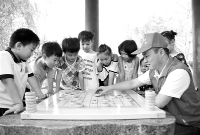 7月10日,青年志愿者赵腾与留守儿童一起下象棋。暑假期间,河北省河间市团市委组织青年志愿者开展“微爱接力”农村留守儿童志愿帮扶公益活动,让孩子们感受到社会的关爱和温暖。 新华社记者 朱旭东 摄