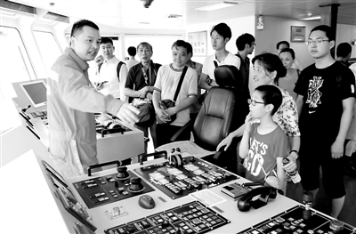 7月11日,“东海救101”轮二副杨凯(左)在驾驶舱内向登船参观的市民介绍船上设备。 当日,2018年中国航海日主题活动启动仪式暨舰船开放日在上海国际客运中心码头举行。
