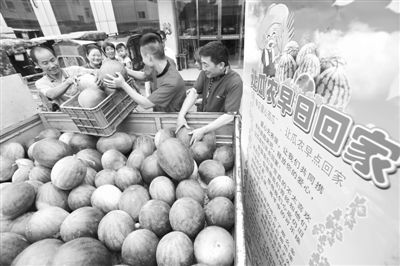 7月11日,河南许昌一酒店员工卸运买来的“爱心西瓜”。该酒店开展“情暖瓜农免费住宿”活动,在预留部分客房的同时,买来简易铁床安放在会议室,开设“瓜农之家”,承诺瓜农晚上可随时来酒店免费住宿,并为瓜农提供免费停车、看车服务。同时,酒店员工还争买“爱心西瓜”,并组织员工中午走上街头,为瓜农送午餐。