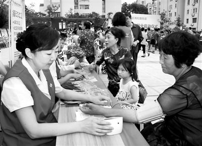 7月12日,在青岛市北区海伦路街道广场举办的启动仪式上,志愿者为社区居民测量血压。