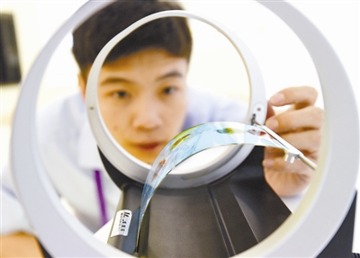 7月13日,在廊坊市霸州经济开发区高新技术产业园维信诺公司,技术人员在对柔性测试样品进行检查。