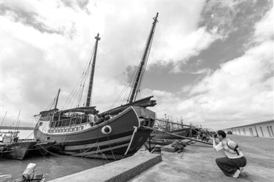 7月13日,一名游客在拍摄一艘停靠码头的仿古木帆船。该船长31米,宽3.3米,排水量245吨,三桅四帆,是岑氏木船作坊打造的经典仿古木帆船。