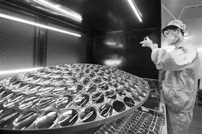 7月12日,在江苏省丹阳市江苏明月光学眼镜有限公司,工人在生产线上进行镜片加膜作业。