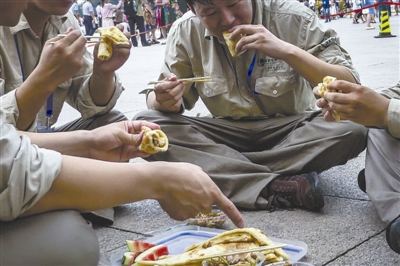7月10日中午,华灯班的队员们在天安门广场上吃午餐。