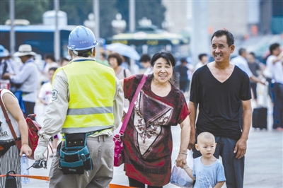 7月10日,来自山西的老两口带着外孙在天安门广场上旅游时,被正在作业的华灯班吸引想凑近看。