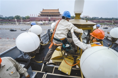 7月5日,北京长安街,闷热。华灯班的老班长孟庆水一如往常带着华灯班20多人在天安门广场上作业。拆卸、擦拭、清洗、安装、固定……在华灯清洗检修车的帮助下,他们检修完一基华灯大约需要半个小时。