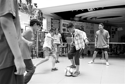 7月16日,北京市丰台区方庄地区职工子女暑期托管班开班,孩子们在老师的带领下练习足球。