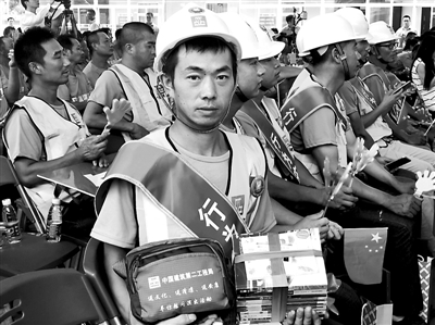 7月12日,湖北潜江项目工地上的农民工收到了“送清凉关爱大礼包”和全国电子职工书屋阅读卡等慰问品。当天,由中建二局工会、中国工人出版社主办的“网聚职工正能量,寻找最美建筑工匠”活动同时在工地启动。金定刚 摄