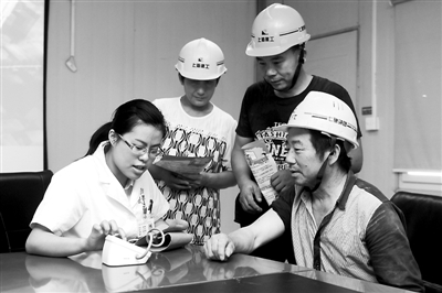 7月17日,合肥市常青街道社区卫生服务中心的医生束文琳(左一)为农民工体检。