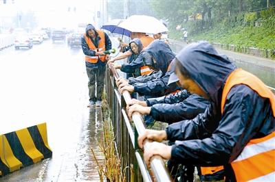 7月17日,北京雨水天气持续,市政应急抢修队的队员们在雨中坚持作业,确保消除回龙观地区一处桥下的安全隐患。该地区因前日短时间内暴雨导致严重积水,部分路段侧面墙体损毁,影响市民出行安全。
