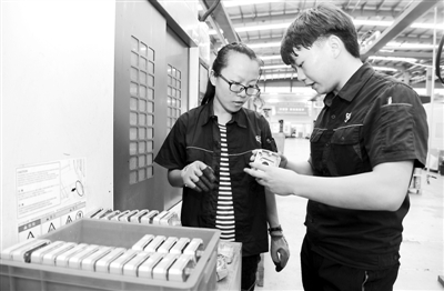 7月17日,江苏省海安市,陕西籍的张加诚(右)在江苏铭利达科技公司CNC车间与同事探讨压铸工艺,他的月收入达6000多元。