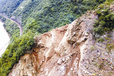 根据塌方地段情况,中国铁路西安局集团有限公司邀请地质专家联合检查塌方山体坡面情况,认为该山体坡面仍在蠕动变形,坡面坍塌有进一步扩大的可能。为了保证线路抢险期间安全和线路开通后的行车安全,抢险指挥部决定对坍塌坡面断裂带影响范围内的山体边坡全部实施减载。唐振江 摄