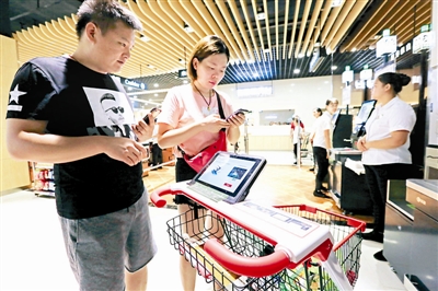 7月18日,湖北省襄阳市,顾客在一家刚开业的超市利用自助付款购物车支付货款。这种购物车的正面有一个10寸的液晶显示屏,顾客用手机扫描二维码进入APP后,通过显示屏背部的摄像头扫描要购买的商品。选好商品即可进行网上支付,无需再排队等待。