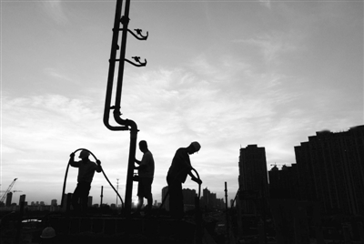 7月17日,江苏省淮安市,建筑工人利用傍晚时分晚凉施工。