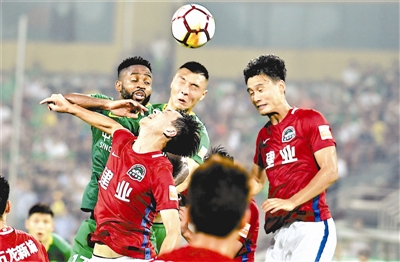 7月18日晚,2018赛季中超联赛第12轮赛比赛,北京中赫国安主场2比1战胜河南建业,国安积分提升到25分,升至积分榜首位。图为双方球员在门前争抢头球。