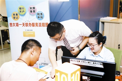 当日,“四大项一天联办服务专窗”在广州市越秀区政务服务中心亮相。据介绍,在符合申办条件、材料齐全的前提下,一天即可完成营业执照、刻章备案证明领取及银行开户、新开业税务等四大事项的办理。