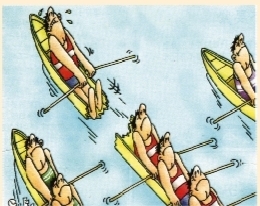 划船比赛你争我夺,不甘人后。这位选手本想后来居上,没想到用力过猛将小舟“蹬”成两半,可惜了——“英雄竞折腰”。