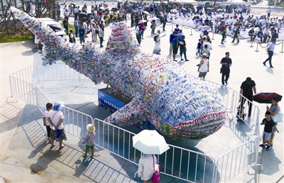 近日,2018日照海洋狂欢季在山东日照海洋公园拉开帷幕。其中,一个由4万多个废旧塑料瓶制作而成的“环保鲸鲨”艺术作品亮相海洋公园广场,吸引众多市民和游客驻足观赏。据了解,这些废旧塑料瓶是由万余名游客和学生从海边捡拾收集而来。新华社发 (尹召功 摄)