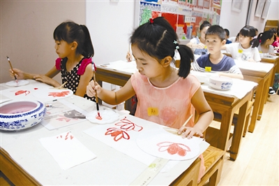 7月19日,故宫暑假知识课堂第一期活动 “宫中好乘凉”开课。在课堂上,学生们了解了古人的消暑妙招,见识了明清皇室的消暑法宝。在现场还可以绘制一把属于自己的团扇。连续五周,故宫将面向中小学生带来6大主题22场活动,让孩子们了解宫廷生活、古建珍宝。图为学生们在绘制自己的团扇。