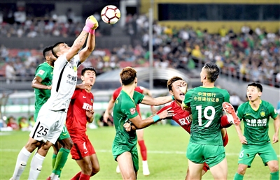 7月22日,在2018赛季中超联赛第十三轮比赛中,北京国安队主场以3比2战胜天津权健队。图为国安队门前的混战。 本报记者 许之丰 摄