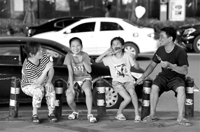 逛街之余,一家人坐在街边吃冰棍解暑(7月20日摄)。