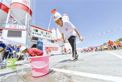7月21日,在福建省厦门市新建福厦铁路8标段项目工地,中铁四局的建设者在参加安全帽运水比赛。