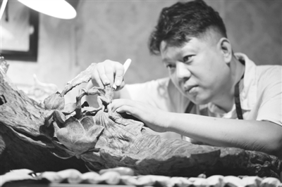 “郭氏木雕”传承人郭栋在工作室内进行木雕创作。其作品多以人物、动物、花鸟虫鱼为创作题材。近年来,非遗传承人郭栋在继承发扬传统木雕的基础上,不断创新,将木雕造型制成蜡模,通过加工制成铜雕艺术品,作品深受人们喜爱。