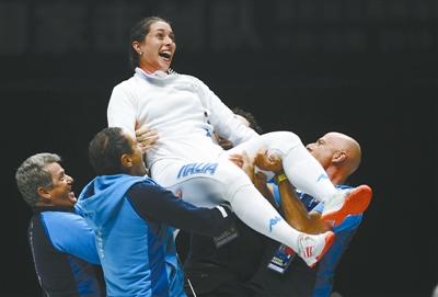 7月22日,意大利选手纳瓦利亚获胜后被教练组抬起庆祝。