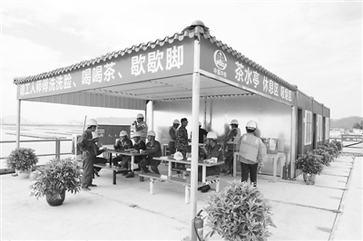 入伏后,中铁大桥局金海大桥项目部在施工现场搭设凉棚和饮水点,备有足够的饮用水、凉茶及清凉油等防暑降温用品。丝丝凉意让户外劳动者体验到关爱。(邹明强 孟庆虎 胡盛志)