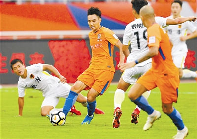 7月25日,山东鲁能队球员吴兴涵(左二)在比赛中进攻。