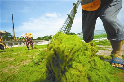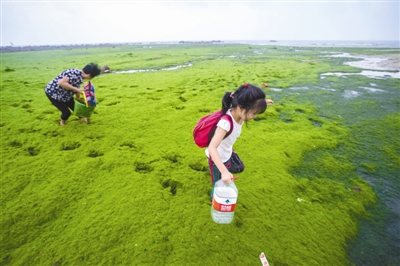 7月21日清晨,青岛市石老人海水浴场,一位老人带着孙女在浒苔覆盖的沙滩上捡海货。每年夏季,青岛海域爆发的浒苔不仅给人们的生活带来了诸多不便,也严重影响了青岛的城市生态形象。