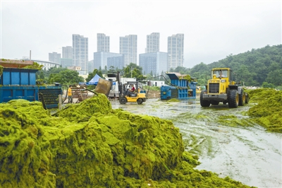 “打捞浒苔有半个月了,每天工作近10个小时。”7月16日,在岸边清理浒苔的王友刚说。他和工友早上7时多开始忙碌,一直到下午5时结束。在王友刚的身后,一个吊车正将装满新鲜浒苔的网兜缓缓吊送到等候在此的卡车上。大约10分钟后,这辆长约7米,高约2.5米的卡车就被装满。随即,这辆卡车会将浒苔运往压榨区,再加压、脱水,打包成一块重约3吨的方块。不到1个小时,这些方块又会趁鲜送往浒苔处置基地,用于制作饲料、肥料等。