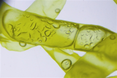 在植物分类学上,浒苔属于绿藻类,由单层细胞组成,围成管状或粘连为带状。它非常纤细,但透过解剖镜观察能看到浒苔的藻体内有许多气囊。“浒苔不是青岛独有的,世界沿海各国也普遍发生,只是程度不同。”袁源介绍说,“我们现在所说的浒苔,其实是指由浒苔所引发的绿潮现象,在国外已被视作和赤潮一样的海洋灾害。”在袁源和她的团队看来,这些气囊为浒苔的高值化利用提供了广阔前景。“海藻里的成分很多,但多糖占的比重比较大。”袁源说,在去年的实验中,她们已初步探明浒苔多糖在吸水、吸油、起泡等化工方面的功能活性,以及在抗氧化、降血脂等方面的医用生物活性,这种特性为浒苔在食品、制药、农业生产等方面的高值化综合利用提供了理论基础。