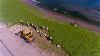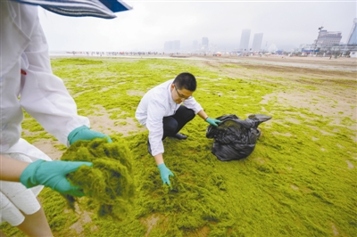 7月20日,中国农业科学院烟草研究所海洋农业研究中心的两名科研人员正在海滩上采集浒苔样品。