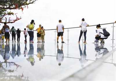 7月29日,在海南三亚亚龙湾热带天堂森林公园,人们在海景玻璃栈道上观光。