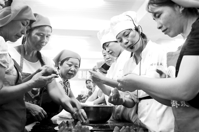 7月30日,江西遂川县2018年第四期“月嫂(育婴师)”免费培训班上家政老师正在传授月子餐制作。